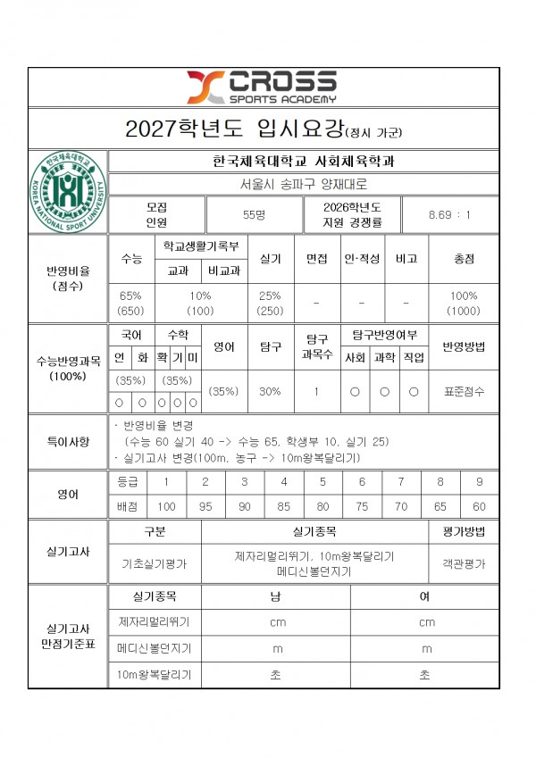 한국체육대학교 사회체육학과 모집요강