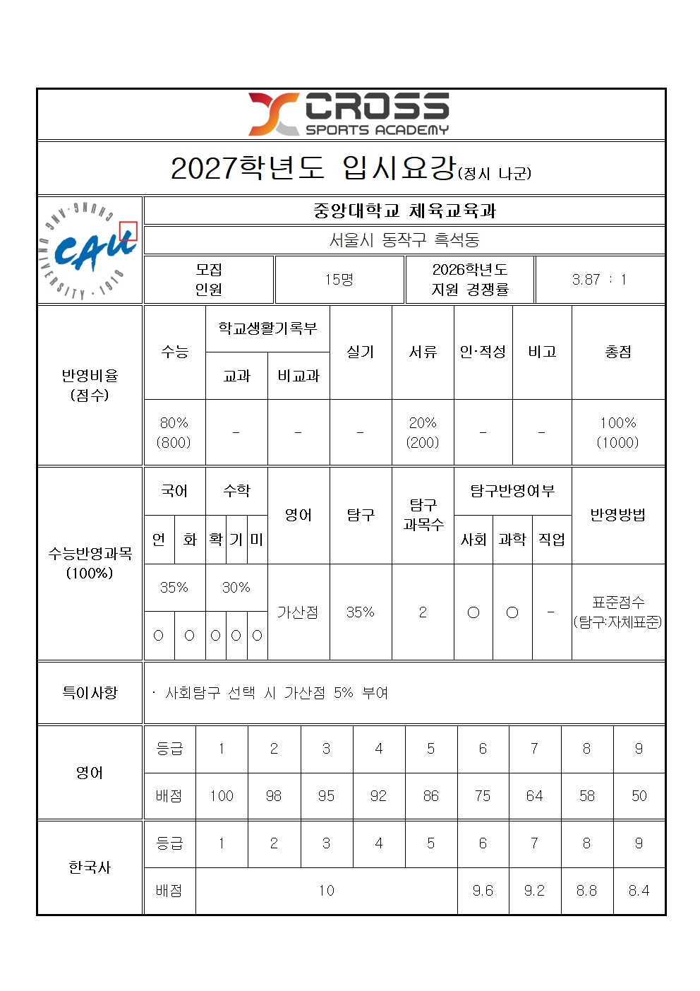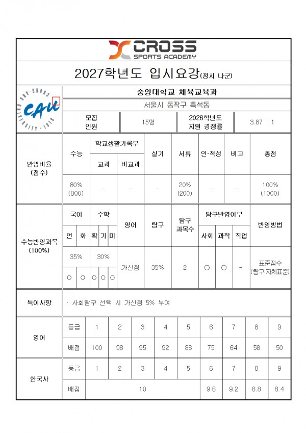중앙대학교 체육교육과 모집요강