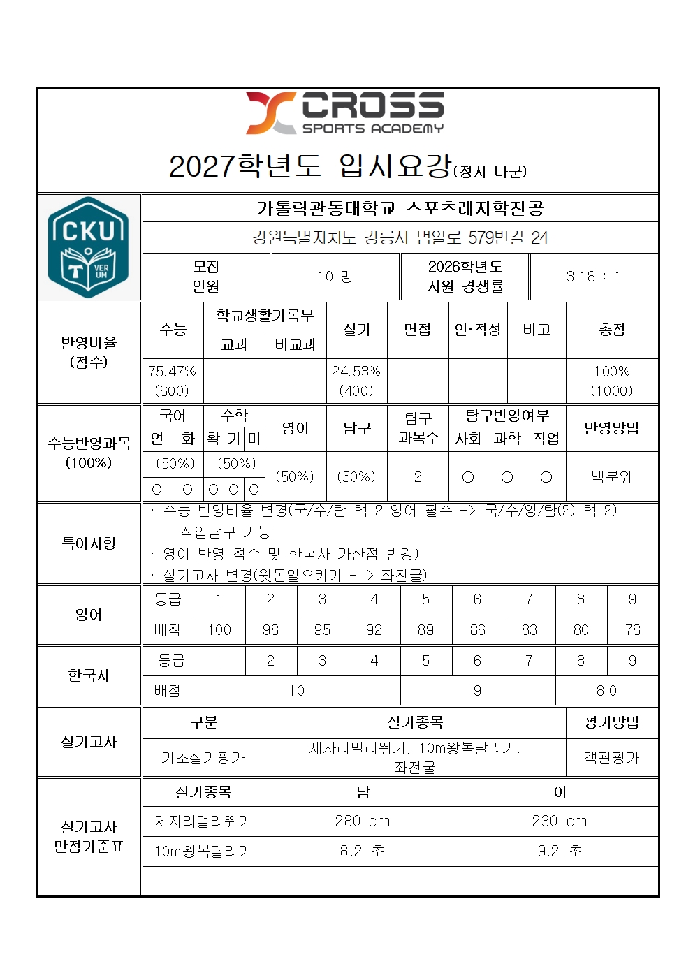 관동대학교 스포츠레저학전공 모집요강